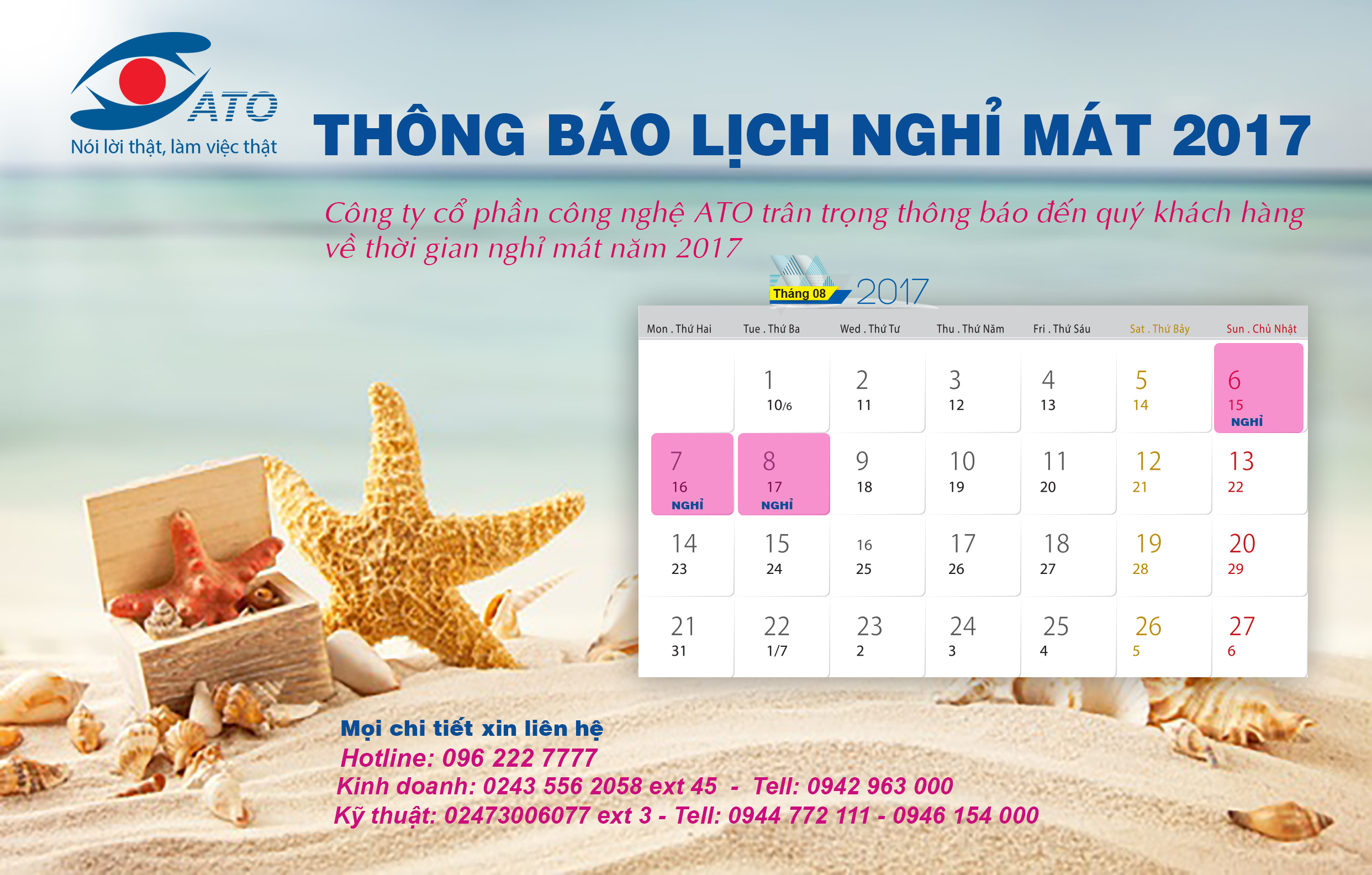 Thời gian nghỉ: Chủ nhật (ngày 06/08/2017) đến hết thứ Ba (ngày 08/08/2017)